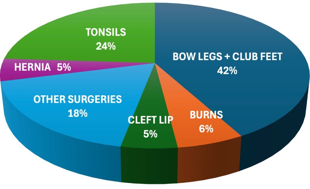 9 local surgeons perform over 1000 basic surgeries a year with some help from overseas surgeons, the most common surgeries are hernia repair, laparotomy for intestinal obstruction, tonsillectomy, nasal polyp’s cauterization, burn contracture release, cleft lip and palate repair.
